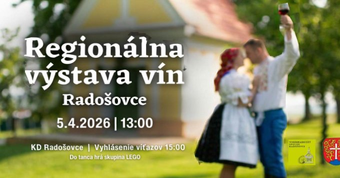 Týmto Vás pozývame na Regionálnu výstavu vín v Radošovciach, ktorá sa uskutoční dňa 05.04.2026 v Kultúrnom dome v Radošovciach.
